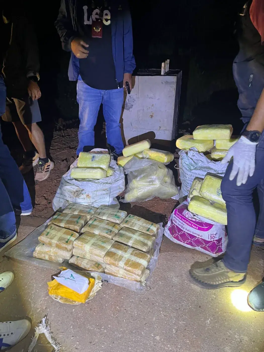 เจ้าหน้าที่เข้าตรวจค้นจนพบถุงพลาสติก 6 ถุง ภายในบรรจุยาบ้ากว่า 608,000 เม็ด และยังวางแผนล่อซื้อดักซุ่ม จนสามารถสกัดจับรถกระบะอีซูซุ ดีแม็กซ์ สีดำ ทะเบียน กอ 8466 สงขลา พร้อมผู้ต้องหาเพิ่มอีก 2 คน รวมยึดของกลางยาบ้าได้ทั้งหมดกว่า 1,376,000 เม็ด พร้อมโทรศัพท์มือถือ 6 เครื่อง และรถยนต์รวม 3 คัน