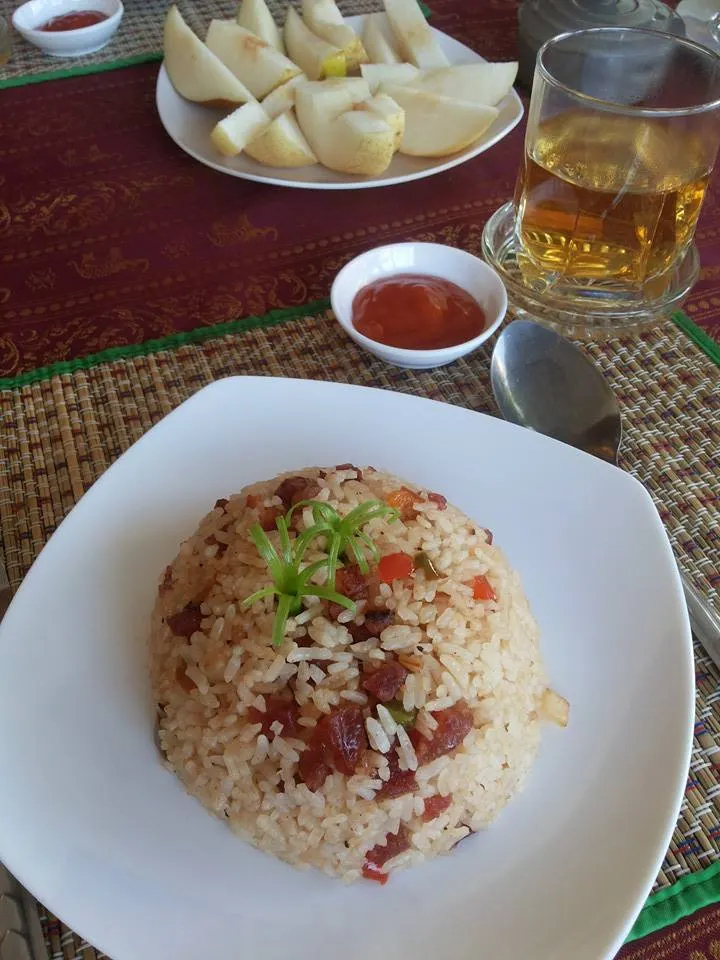 เช้านี้กับเมนูข้าวผัดกุนเชียงเลยหัวเราะไปจนเหนื่อย ใช้เวลาในการทานอาหารเช้านานหน่อยเพราะว่าทานไปหัวเราะไป มีความสุขดี โฮสเดินมาบอกเราว่า ตอนนี้แม่บ้านสองคนนั้นไปเรียนในเรื่องของการทำอาหาร และการจัดอาหารภัตตาคาร เราชอบไม่ชอบอะไรนั้นบอกได้ เขาจะได้ทำการปรับปรุงในส่วนที่ยังไม่ดี