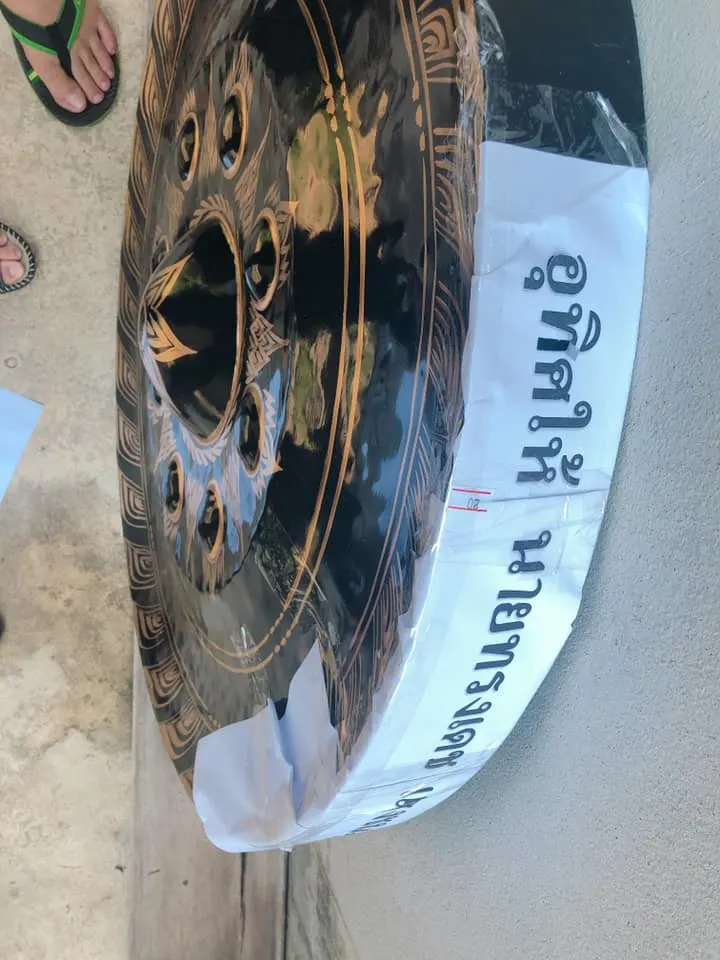 ในตอนแรกนั้นเรายังไม่ได้เห็น พอนำมาเพื่อที่จะแกะสลักและฉีดสีเรานั้นค่อยเห็น ใหญ่เหมือนกัน และคนเฒ่าคนแก่นั้นบอกว่าหากว่าเรานั้นถวายเจ้าฆ้องนี้นั้น เวลาที่มีการตีฆ้องนั้นมีการสาธุของเหล่าชาวบ้านที่ได้ยินเสียง มันจะยิ่งทำให้ส่งผลบุญให้กับคนที่ถวายนั้นได้ในส่วนกุศลเข้าไปอีก ลวดลายของฆ้องนั้นถือว่าสวยงามสมราคา ตอนนั้นที่ซื้อนั้นถือว่าราคาไม่ได้แพงมากเพราะว่า คนขายนั้นต้องการที่จะกลับบ้านและไม่อยากที่จะแบกฆ้องใหญ่นั้นกลับ จึงขายให้ในราคาที่ทำบุญร่วมกัน น่าจะราคาประมาณแปดร้อยบาท แต่ว่าหนาและเสียงดีมาก
