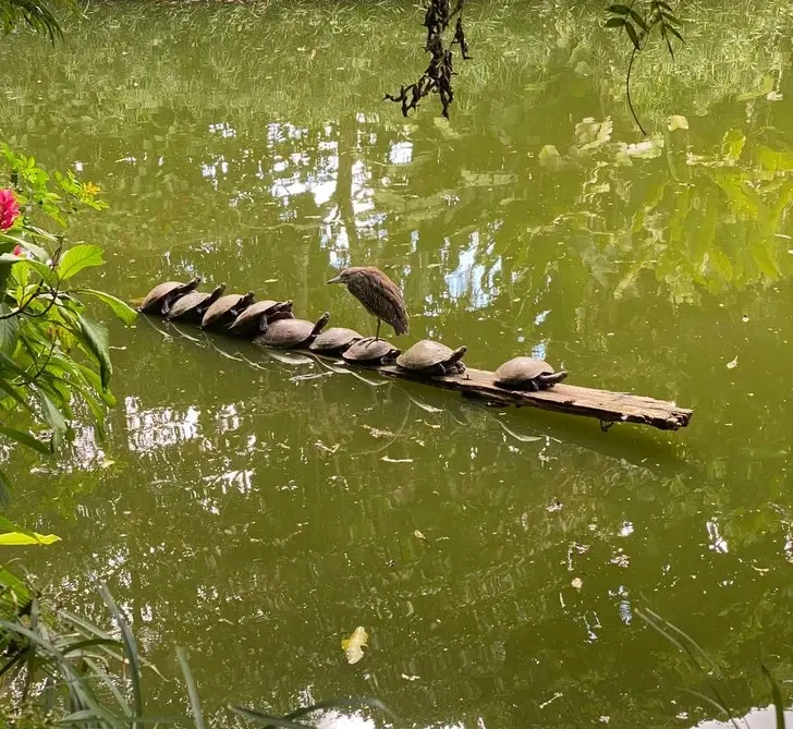 15. ฉันพบกับภาพที่น่าทึ่ง! เต่า 9 ตัวและนก 1 ตัวที่กำลังพักผ่อนอย่างสบายอารมณ์