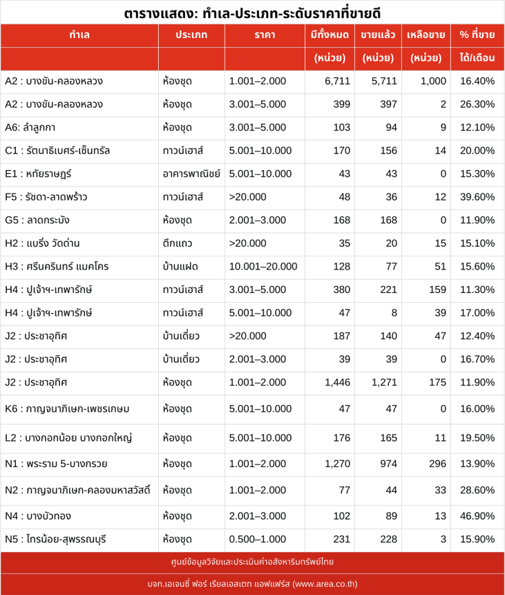 โปรดดูตารางต่อไปนี้: ทำเล-ประเภท-ระดับราคาที่ขายดี