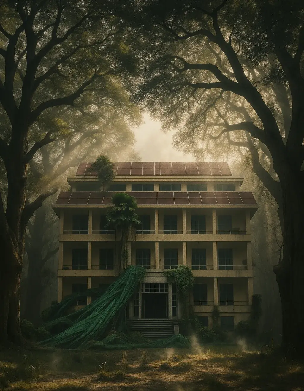 กำแพงผุกร่อน สีลอกล่อนหลุดเป็นแผ่นใหญ่ เถาวัลย์พันเกี่ยวกับหน้าต่างแตก ๆ จนเหมือนบาดแผลบนร่างคนแก่ เสียงนกพิราบบินวนอยู่เหนือหลังคาพร้อมเสียงกระพือปีกวุ่นวายที่สะท้อนก้องในโพรงว่างเปล่า ทั้งหมดนั้นโอบล้อมอาคารให้ดูหนักอึ้งและอับชื้นจนไม่เหมือนสิ่งมีชีวิตที่ควรจะคงอยู่