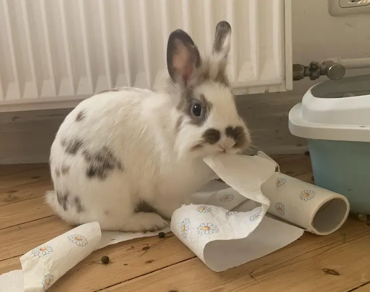 11. นี่คือสภาพของเจ้ากระต่ายของบ้านฉัน ตอนที่มันถูกจับได้คาหนังคาเขา ว่ากำลังกินกระดาษเช็ดมืออยู่