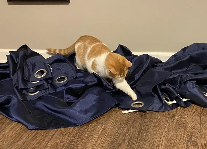 14. แมวของฉันชอบเล่นผ้าม่านมาก มันจะพยายามทุกวิธีเพื่อฉีกผ้าม่านลงมา แล้วเริ่มเล่นในแบบของมัน