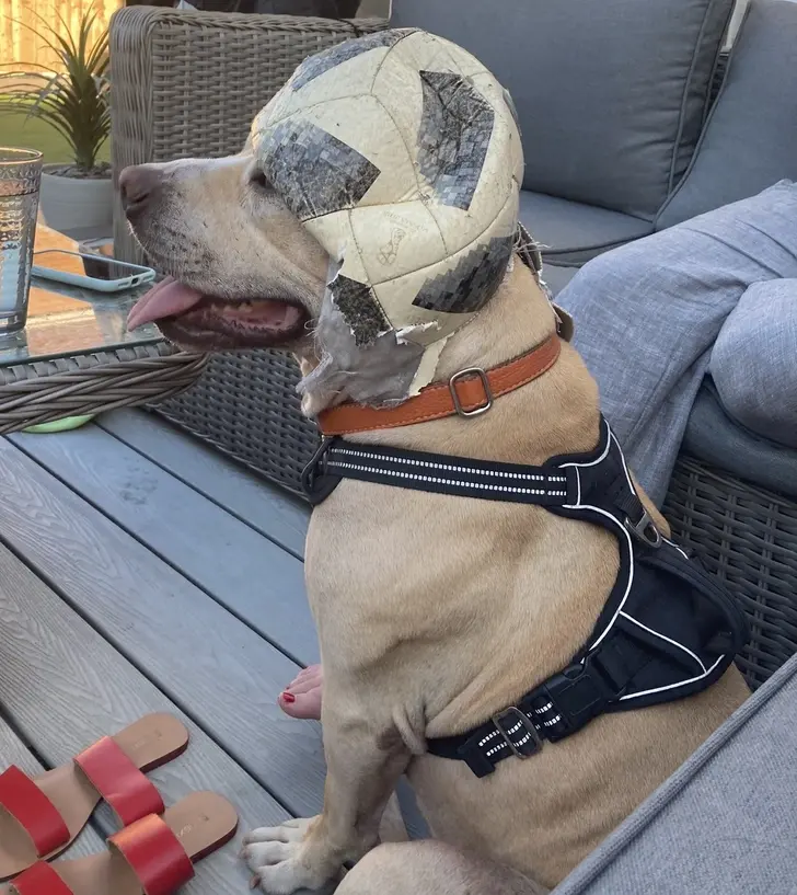 15. เจ้าไซอัน สุนัขของเราฉีกลูกบอลของหลานชายของเราเป็นชิ้นเล็กชิ้นน้อย และตอนนี้เขาก็สวมมันเหมือนกับว่าเขาอยู่ในภาพยนตร์เรื่อง Silence Of The Lambs