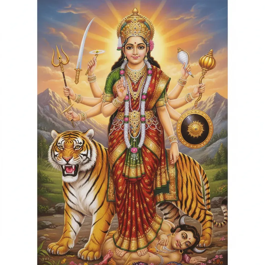 พระแม่ทุรคา (Durga) คือเทพีผู้เป็นสัญลักษณ์ของพลัง ความกล้าหาญ และชัยชนะเหนือความชั่วร้าย พระนาม "ทุรคา" มาจากภาษาสันสกฤต แปลว่า “ผู้เข้าถึงได้ยาก” หรือ “ผู้เอาชนะได้ยาก” ซึ่งสะท้อนถึงพลังอำนาจและความยิ่งใหญ่ที่ไม่มีสิ่งใดสามารถต้านทานได้ พระองค์เป็นปางหนึ่งของพระแม่อุมาเทวี ชายาของพระศิวะ และได้รับการยกย่องอย่างสูงในนิกายศักติ (Shaktism) ซึ่งถือว่าพระแม่คือ “ศักติ” หรือพลังสูงสุดของจักรวาล ผู้เป็นต้นกำเนิดแห่งพลังทั้งมวล