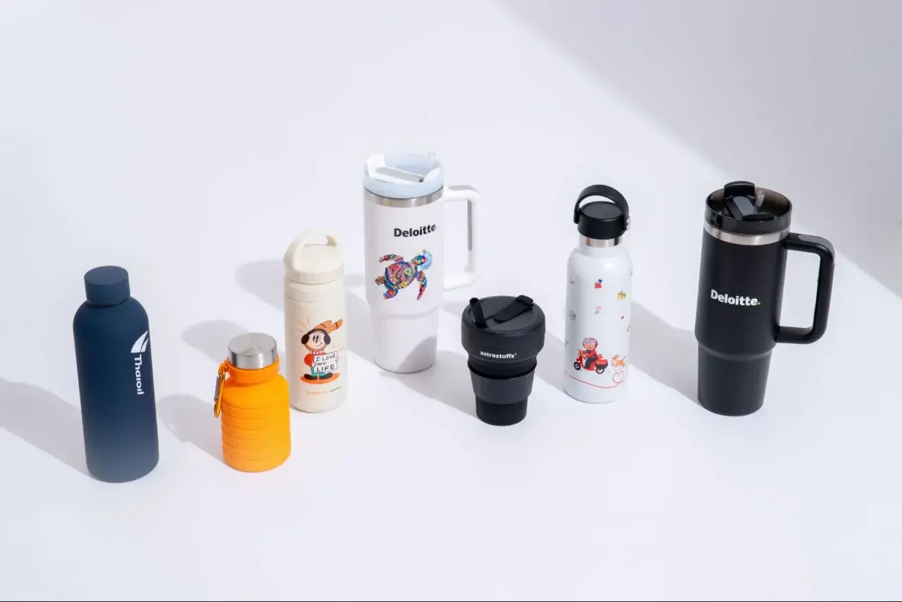 - กระบอกน้ำสแตนเลส/แก้วเก็บอุณหภูมิ กระบอกน้ำสแตนเลสหรือแก้วเก็บอุณหภูมิช่วยเก็บความเย็นหรือความร้อนได้ยาวนาน ให้ความทนทานและดูพรีเมี่ยม เหมาะสำหรับผู้ที่ชอบสไตล์หรู หรือใช้เป็นของแจกในองค์กร สามารถสกรีนโลโก้หรือทำกระบอกน้ำพิมพ์ลายได้ตามต้องการ