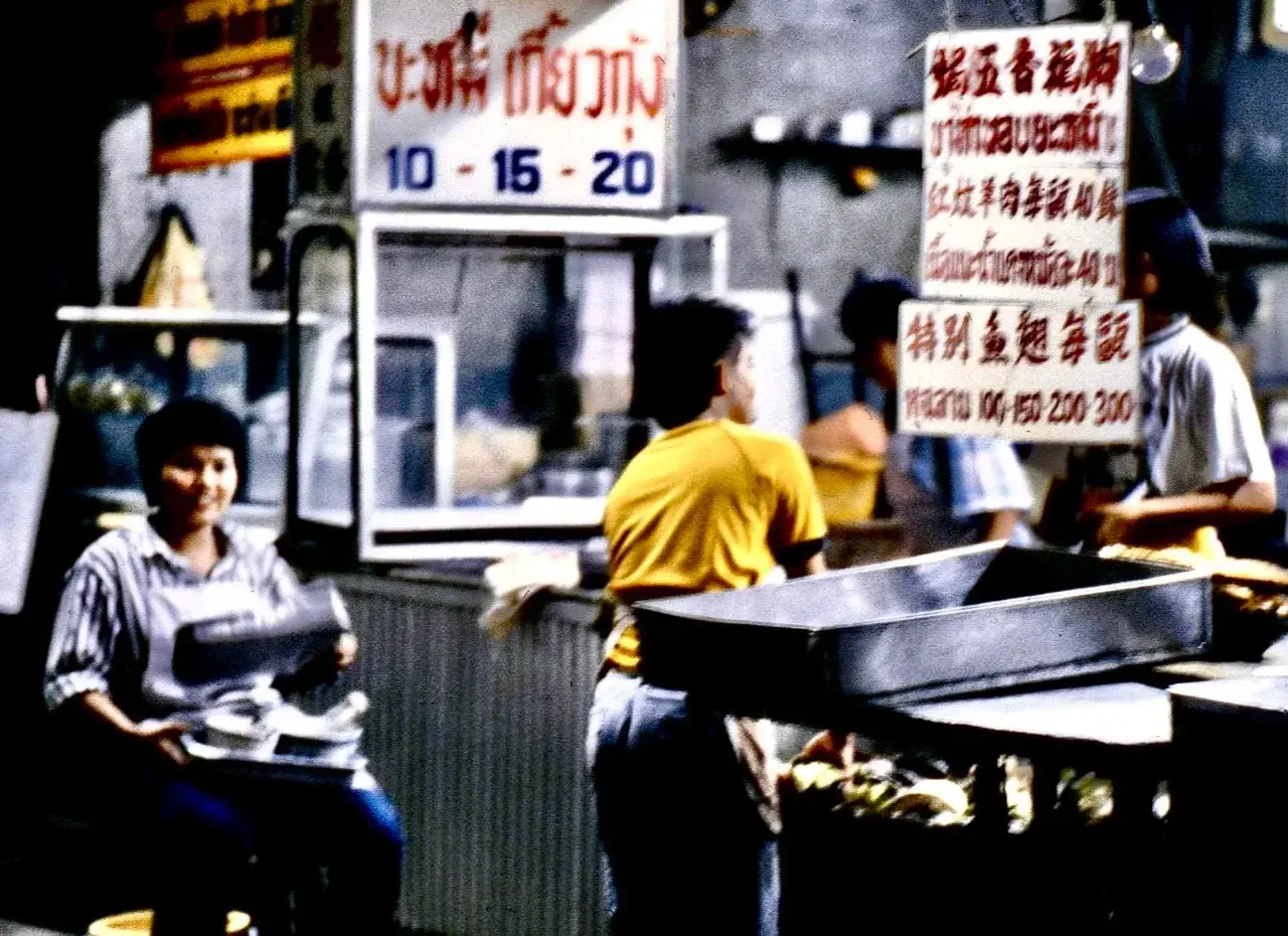 ภาพเก่าในปี 2530 ของ Devid Pirmann เผยให้เห็นความเรียบง่ายและความเป็นกันเองของร้านอาหารริมทางในเยาวราช บะหมี่เกี๊ยวที่ขายในสมัยนั้นมีราคาเพียง 10-20 บาทต่อชาม โดยแต่ละชามเต็มไปด้วยบะหมี่เส้นเหนียวนุ่ม เกี๊ยวหมู และหมูแดงหั่นบาง ๆ เสิร์ฟร้อน ๆ จากหม้อใหญ่ กลิ่นหอมลอยทั่วตรอกซอกซอย