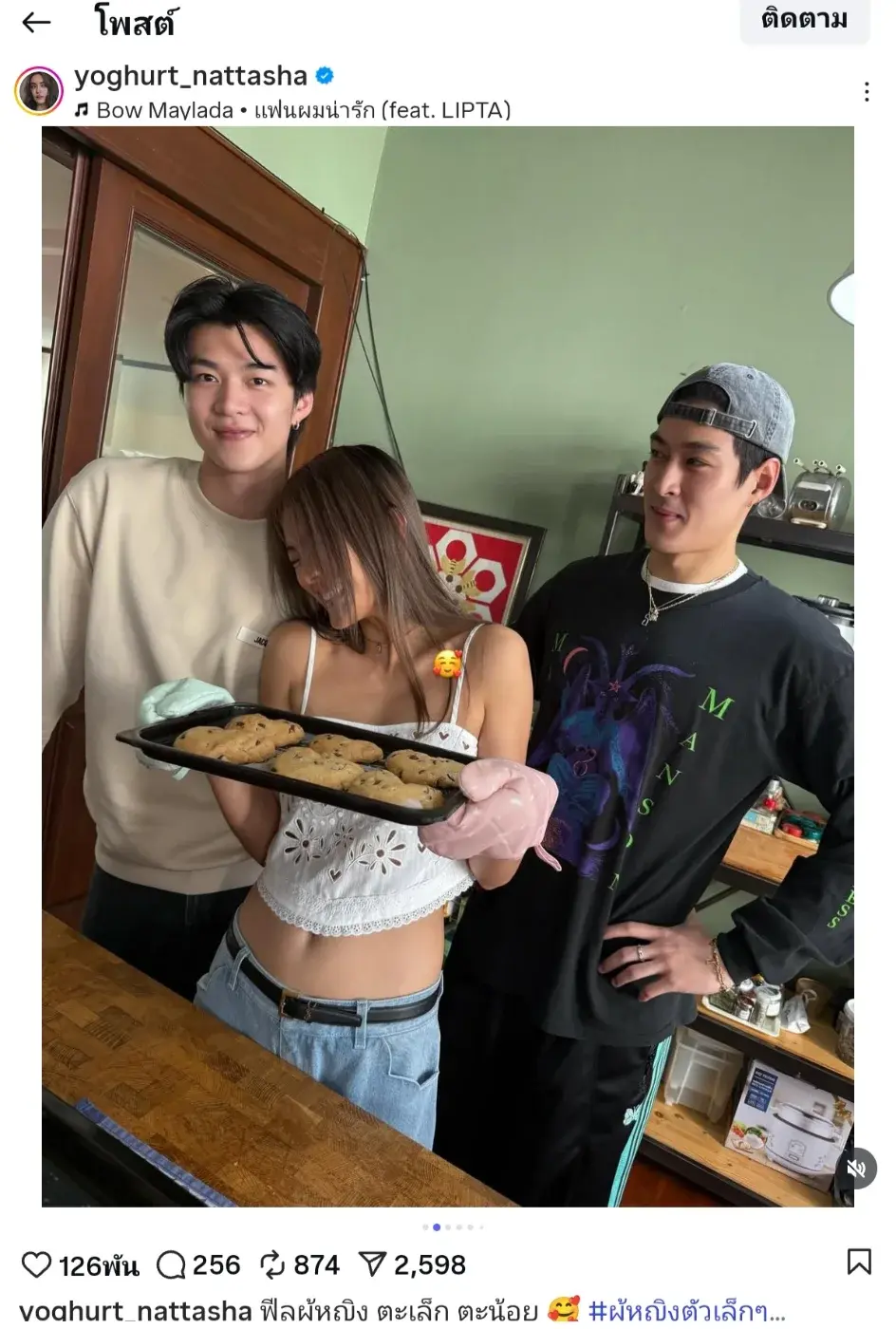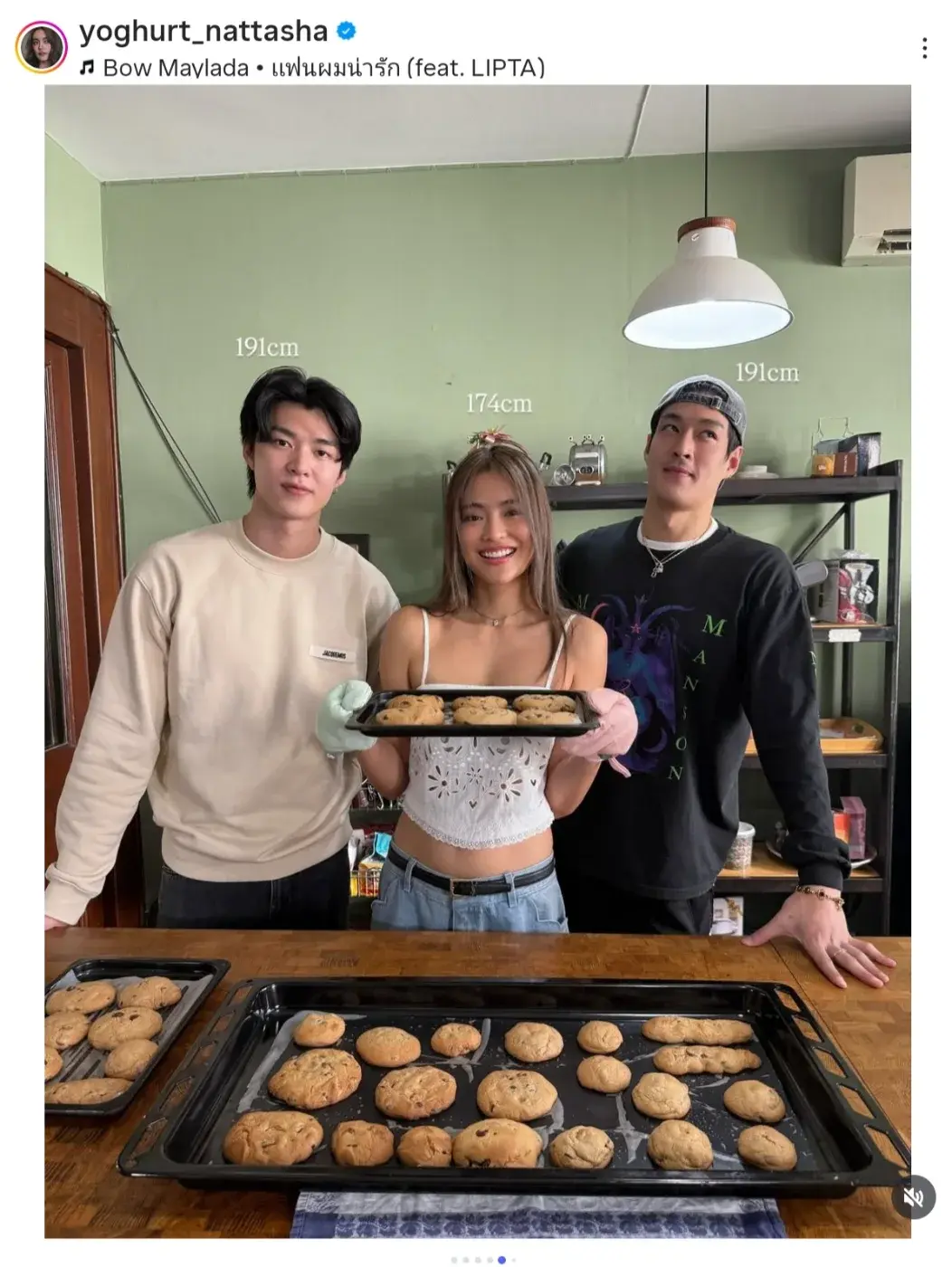 ล่าสุดสาวโยเกิร์ต โพสท์รูปและคลิป การทำคุ๊กกี้รูปหัวใจร่วมกับ 2 นักแสดงหนุ่มร่างสูง กระทิง-ขุนณรงค์ และ มีน นิชคุณ พร้อมแคปชั่นสุดจี๊ดว่า "ฟีลผู้หญิง ตะเล็ก ตะน้อย" เหมือนไม่เคยรับรู้ความรู้สึกมีแฟนสูงกว่าเป็นังไง โดยเปรียบเทียบความสูงของทั้ง 3 คนด้วย