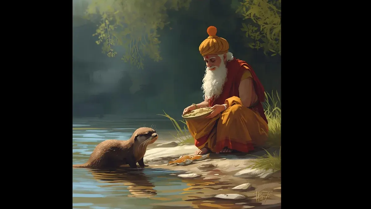 ในวันรุ่งขึ้น บรรดาสัตว์เหล่านั้น นากคิดว่าเราจักแสวงหาเหยื่อแต่เช้าตรู่ จึงไปยังฝั่งแม่น้ำคงคาครั้งนั้น พรานเบ็ดคนหนึ่งตกปลาตะเพียนได้ 7 ตัว จึงเอาเถาวัลย์ร้อยคุ้ยทรายที่ฝั่งแม่น้ำคงคา เอาทรายกลบไว้ เมื่อจะจับปลาอีกจึงไปยังด้านใต้แม่น้ำคงคา นากสูดได้กลิ่นปลา จึงคุ้ยทราย เห็นปลาจึงนำออกมา คิดว่าเจ้าของปลาเหล่านี้มีไหมหนอ จึงประกาศขึ้น3 ครั้ง เมื่อไม่เห็นเจ้าของ จึงคาบปลายเถาวัลย์นำไปเก็บไว้ในพุ่มไม้ อันเป็นที่อยู่ของตน คิดว่า เราจักกินเมื่อถึงเวลา จึงนอนนึกถึงศีลของตนอยู่