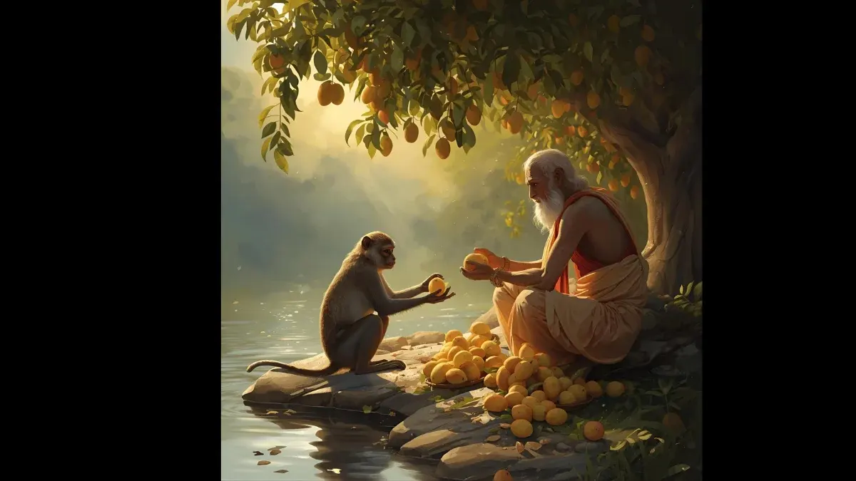 แล้วไปยังสำนักของลิง แม้เมื่อลิงนั้นกล่าวว่า ท่านยืนอยู่ เพื่อต้องการอะไร? พราหมณ์ก็บอกเช่นเดิม เหมือนที่บอกกับสุนัขจิ้งจอก...ลิงกล่าวว่า ดีละ ข้าพเจ้าจักให้ผลมะม่วงสุก น้ำเย็น ร่มเงาอันเย็นเป็นที่รื่นรมย์ใจ ดูก่อนพราหมณ์ ข้าพเจ้ามีอาหารอย่างนี้ ท่านจงบริโภคอาหารนี้ แล้วเจริญสมณธรรมอยู่ในป่าเถิด