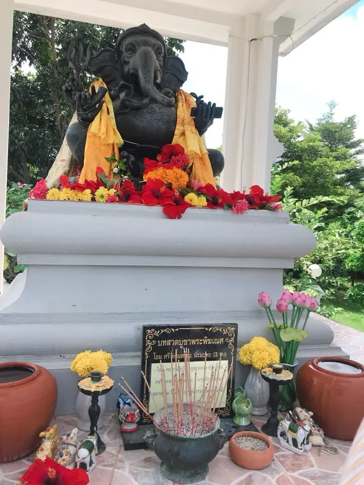 ในสถานที่ที่เรานั้นได้เดินทางไปประจบเหมาะกับวันของพระพิฆเนศ มีการไหว้ด้วยเครื่องเซ่น พร้อมกับพาคณะไหว้พร้อมกัน ทำให้เป็นครั้งแรกที่ได้เห็นขั้นตอนทั้งหมดในการไหว้บูชาพระพิฆเนศ เขาบอกว่าในการไหว้พระพิฆเนศนั้นจะใช้ในส่วนของดอกดาวเรืองที่สดใสเหลืองอร่ามมาก วางไว้ในแจกันทั้งสองด้าน