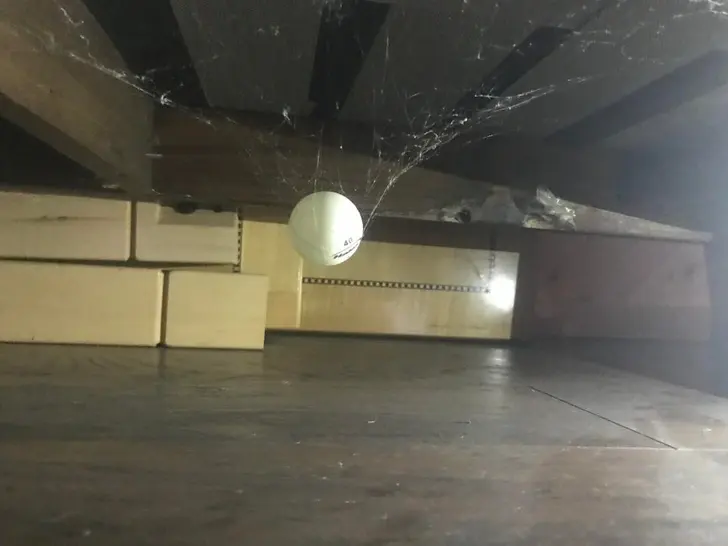 4. ฉันพบลูกปิงปองอยู่ใต้โซฟาในห้องใต้ดินซึ่งมีใยแมงมุมเกาะอยู่ จึงทำให้ลูกปิงปองลอยอยู่กลางอากาศ