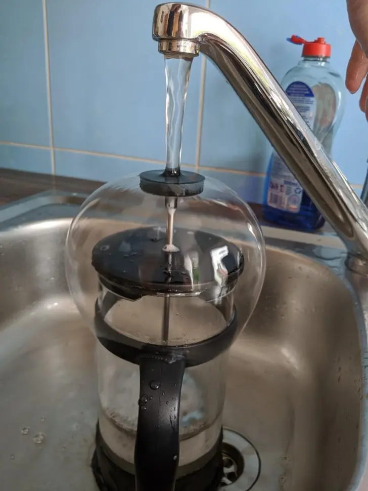 6. น้ำที่ไหลจากก๊อกน้ำได้สร้างโดมน้ำรูปทรงกลมได้อย่างสมบูรณ์แบบ ครอบทับอยู่บนเครื่องชงกาแฟแบบเฟรนช์เพรสนี้
