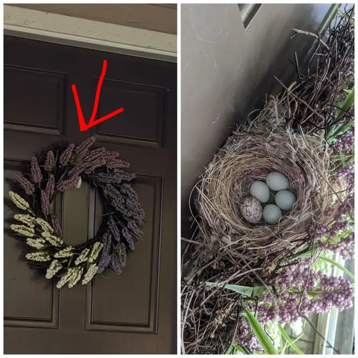 7. ฉันค้นพบรังนกจิ๋วที่น่าทึ่งวางอยู่บนพวงหรีดช่อดอกไม้ที่ประดับอยู่บนประตูหน้าบ้านของฉัน