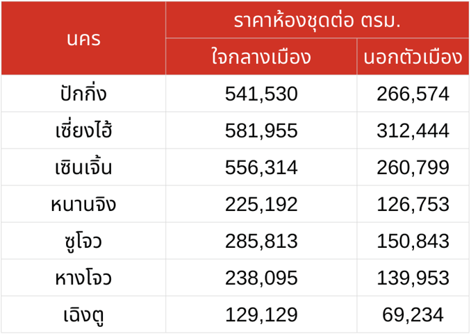 สำหรับราคาที่อยู่อาศัยในประเทศจีน (ห้องชุด) เป็นดังนี้