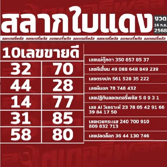 10 เลขขายดี "สลากใบแดง" งวดวันที่ 16 กันยายน 68..พรุ่งนี้รวย คอหวยส่องด่วน!!