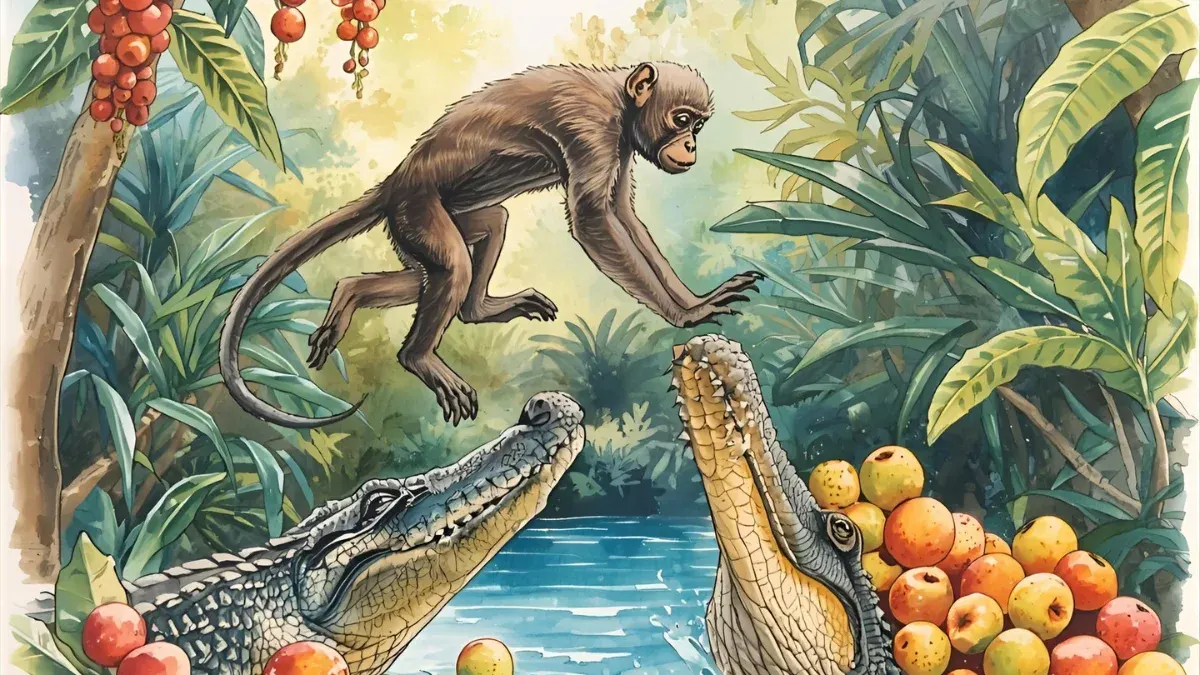 ในแม่น้ำนั้น มีจระเข้ตัวหนึ่งอาศัยอยู่กับเมีย วันหนึ่งเมียจระเข้ซึ่งกำลังตั้งท้องเห็นลิงกระโดดไปมาเกิดอยากกินหัวใจของลิง มันบอกสามีว่า “ฉันอยากได้หัวใจของลิงตัวนี้” จระเข้รักภรรยา จึงรับปากและวางแผนจับลิง โดยไปนอนรอบนแผ่นหินใหญ่ตอนเย็น คิดว่าลิงจะกระโดดลงมาแล้วมันจะงับได้