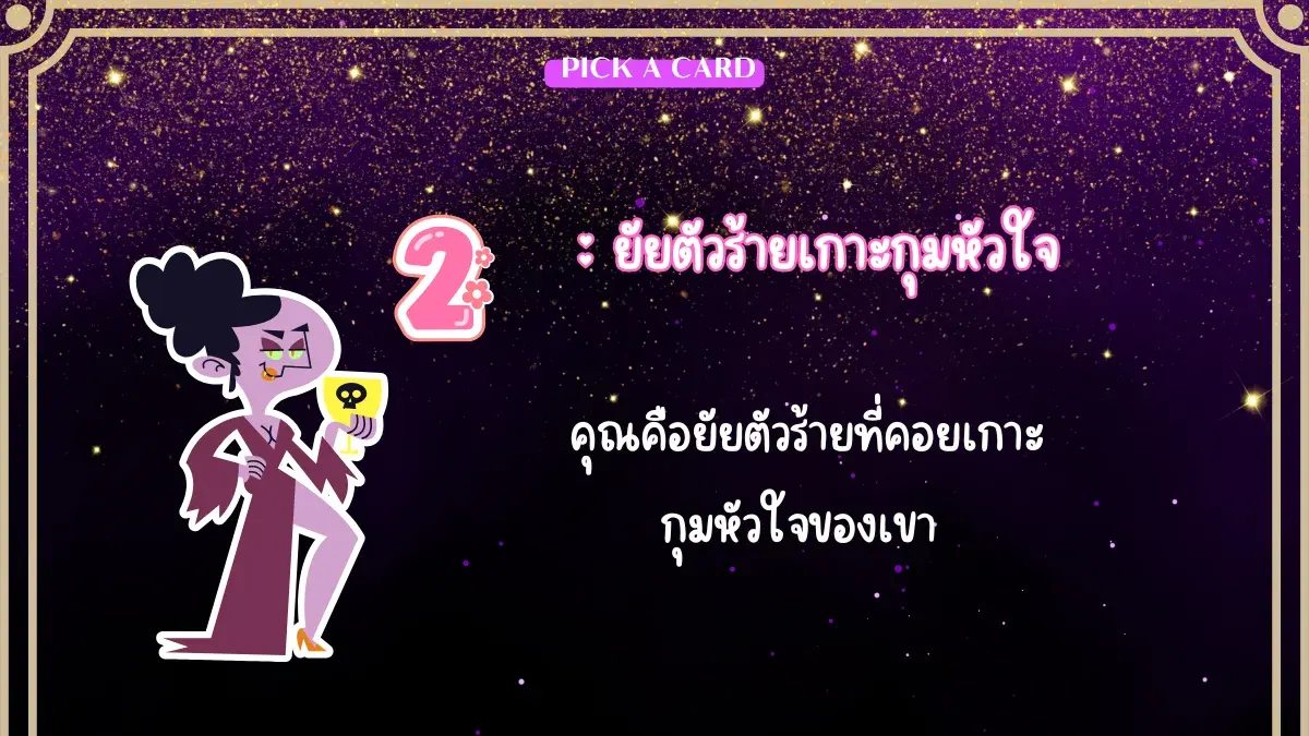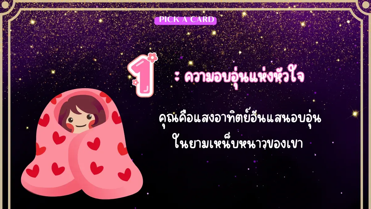 ความรักครั้งนี้ถือเป็นครั้งที่สุขสมหวัง และมีแต่สิ่งดีๆเข้ามาหา Lucky in love ก็ว่าได้ แต่รักครั้งนี้ดีต่อใจขนาดนี้แล้ว คุณมีผลต่อใจเขาอย่างไร เรามาล้วงใจเขากันดูนะคะ ด้วยการทำนายแบบ Pick a card กัน