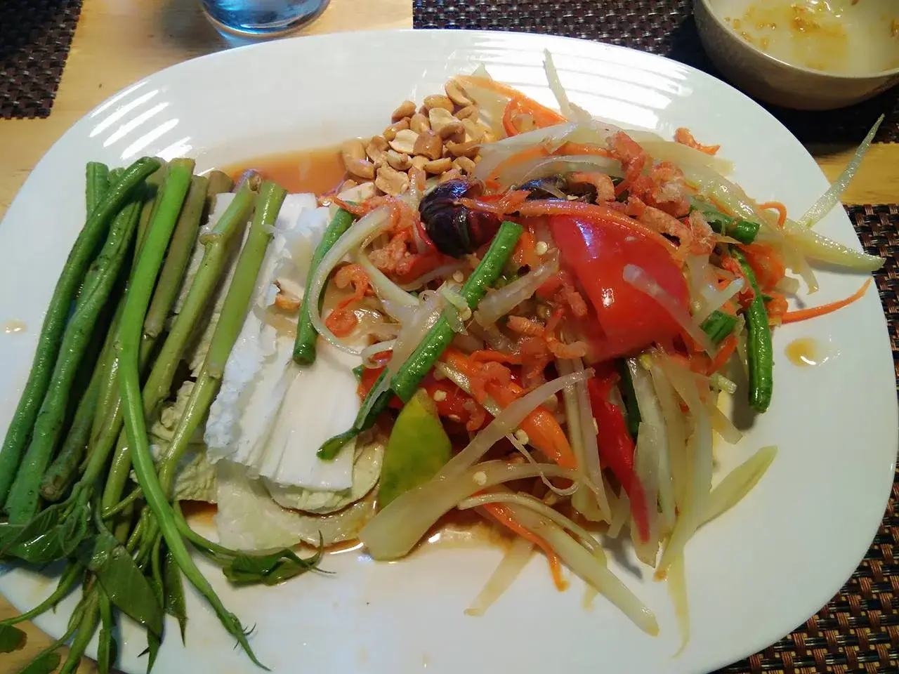 มาดูสีสันของส้มตำในจานนี้ มีความอร่อยและความคงทนสุด รสชาติที่เรานั้นเลือกนั้นจะต้องมีรสชาติที่เผ็ดร้อย เผ็ดน้อย หรือว่าไม่เผ็ดเลยจะอร่อยเหมือนกัน ในส่วนของผักบุ้งที่นำมาเป็นผักที่จะทานควบคู่กันกับส้มตำ อร่อยมากในจานนี้นั้นราคาต่อจานคือราคา 3.5 $ ถือว่าไม่แพงมากในการทานอาหารในเมืองหลวง แต่ว่าอุ่นท้องหรือว่าอิ่มอร่อย ในส่วนของข้าวเหนียวร้อนนั้นเราจะซื้อในราคา 25000 เรียล หรือที่คิดเป็นเงินไทยคือราคา 20 บาทแต่ว่าได้น้อยมาก