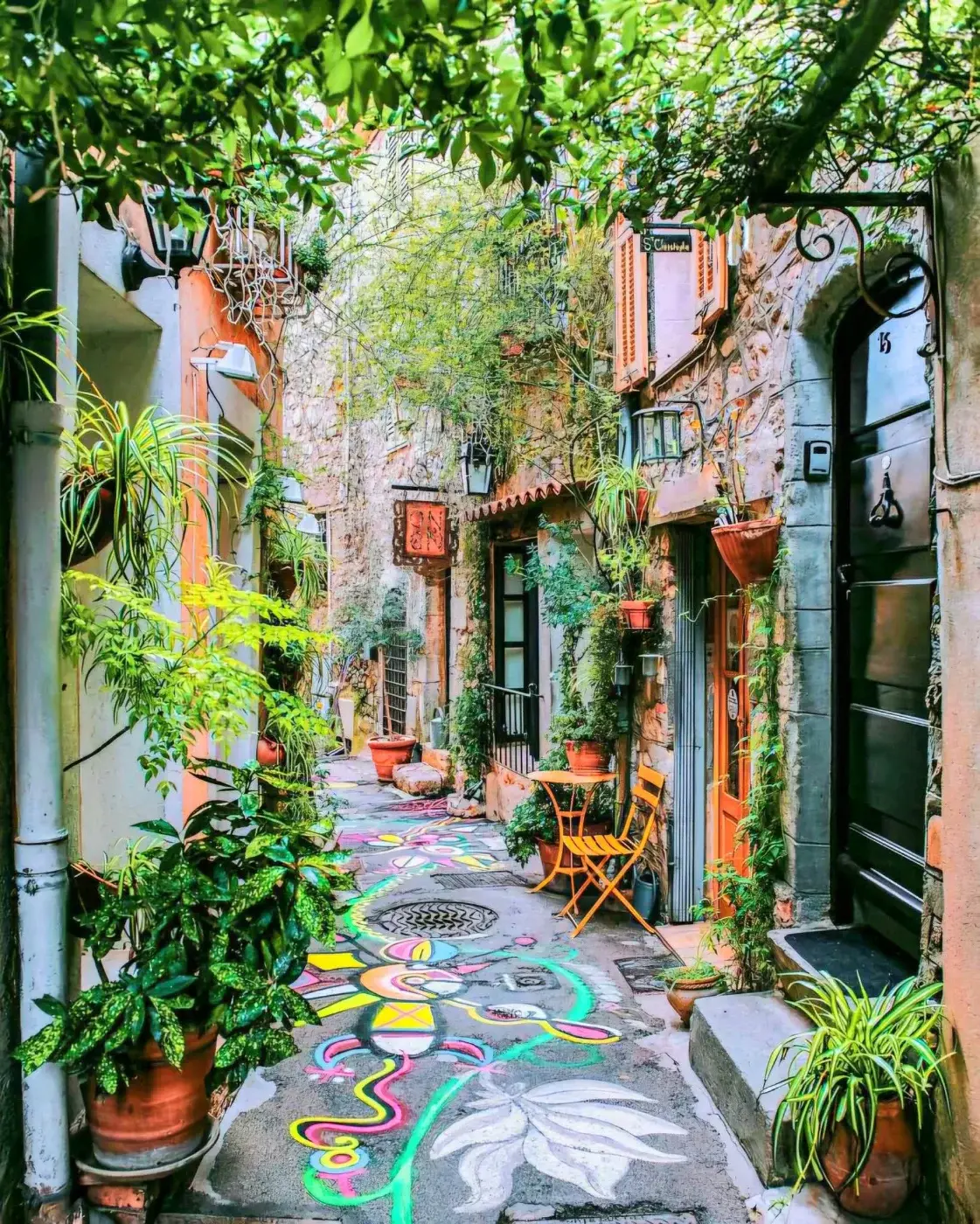 จุดเด่นที่สุดของ Mougins คือ ตรอกซอกซอยแคบ ๆ ที่ปูด้วยหินโบราณ คดเคี้ยวไปตามเนินเขา ตกแต่งด้วยดอกไม้สีสดและภาพวาดบนพื้นถนน สร้างเสน่ห์เฉพาะตัวให้กับนักท่องเที่ยวที่มาเดินเล่น ภาพบนถนนเป็นฝีมือของศิลปินท้องถิ่นซึ่งสะท้อนความคิดสร้างสรรค์อันไม่สิ้นสุด