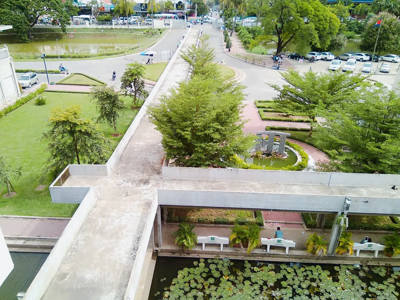 บริเวณนี้คือด้านหน้าของอาคารที่หากว่าเดินตามทางสะพานมานั้นเราจะมาเจอในชั้นสองเลยทันที สามารถที่จะร่วมในส่วนของห้องโถงที่มีการเตรียมไว้สำหรับในการจัดงานใหญ่ๆ คนจำนวนมาก และหากว่ามีการมองลงมาจากชั้นไหนรอบอาคารนั้นสามารถที่จะเห็นการจัดงานได้ทั้งหมดเลย เพราะว่ารอบอาคารนั้นเป็นวงกลมมีในส่วนของจุดศูนย์กลางที่เดียวคือชั้นสอง เรานั้นเดินมาในสะพานนี้น่าจะสองครั้งเพราะว่าเขานั้นจะเปิดในบางช่วงเท่านั้น อย่างในช่วงของการรับปริญญาหรือว่าการเปิดงานภาควิชาอะไรแบบนั้น