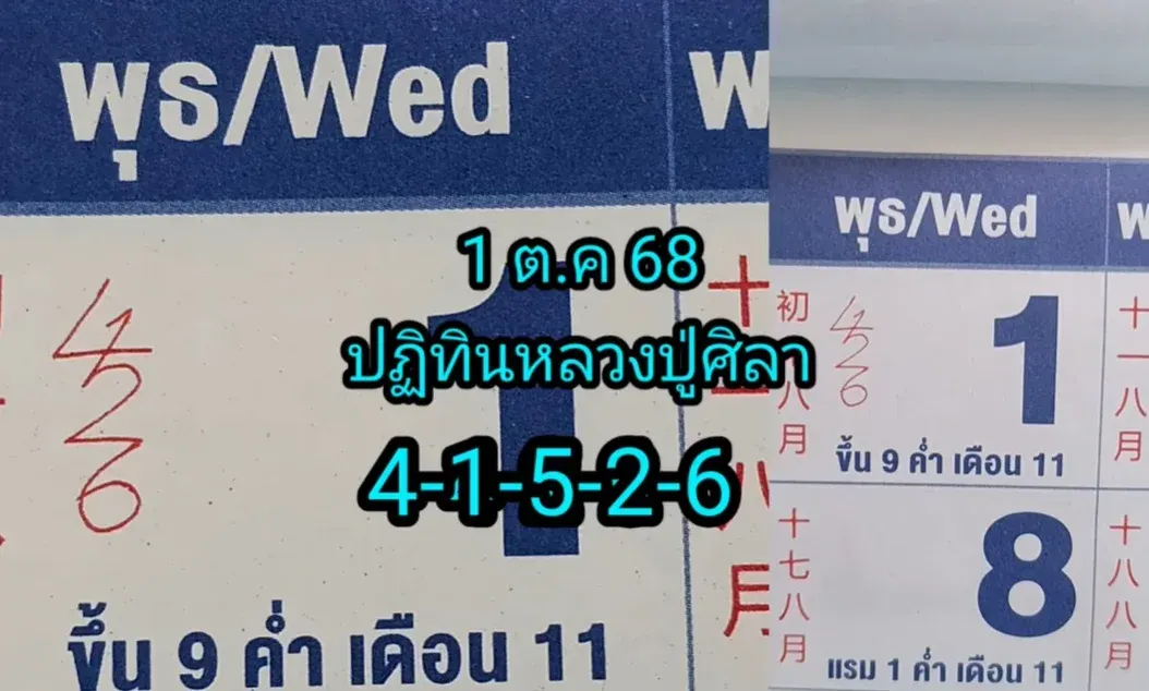 สำหรับหวยในงวดนี้ก็ออกในวันพุธ ที่ 1 ตุลาคม 2568 เราลองมาส่องดูที่ปฏิทิน "หลวงปู่ศิลา" ก็จะพบว่า ตัวเลขที่ให้มานั้นมันประกอบด้วยเลข 4 - 1 - 5 - 2 - 6 ทั้งนี้ก็สามารถจับคู่เป็นตัวเลขต่างๆ ได้ดังนี้ เลขท้าย 3 ตัว คือ 416 - 152 - 625 - 264 - 526 ส่วนเลขท้าย 2 ตัวที่ได้มีดังนี้ 16 - 52 - 25 - 64 - 26 - 14 - 51 - 66 - 54 - 42 สำหรับตัวเลขที่ให้นั้นทุกท่านสามารถนำเอาไปสลับจับคู่กันได้ตามชอบใจ และใช้เป็นแนวทางในการเสี่ยงโชคสำหรับงวดนี้ได้