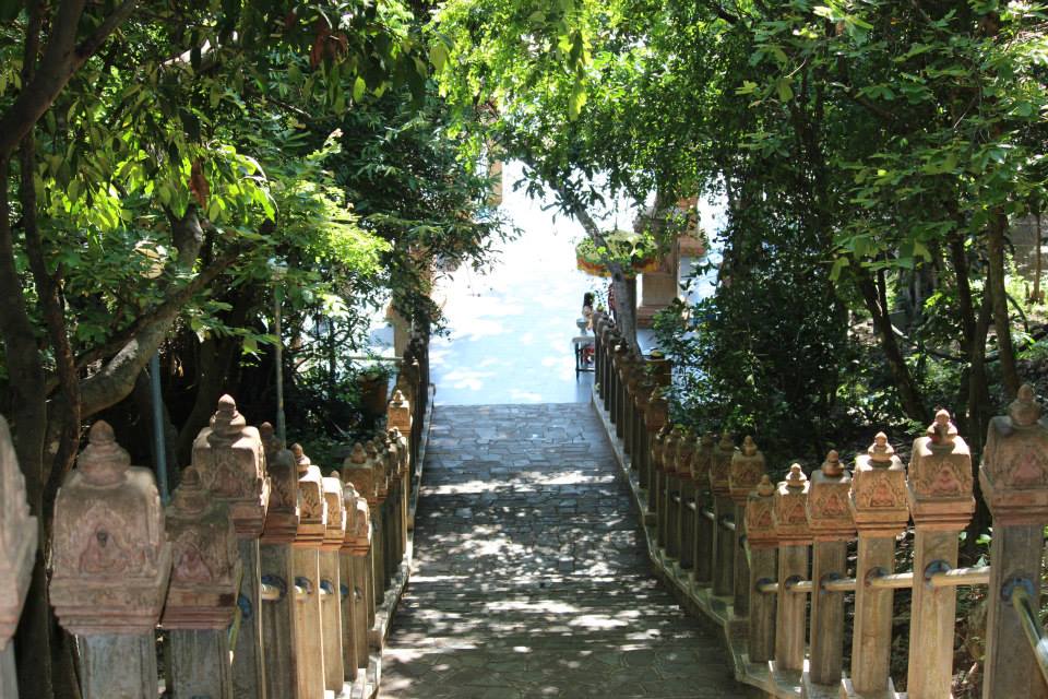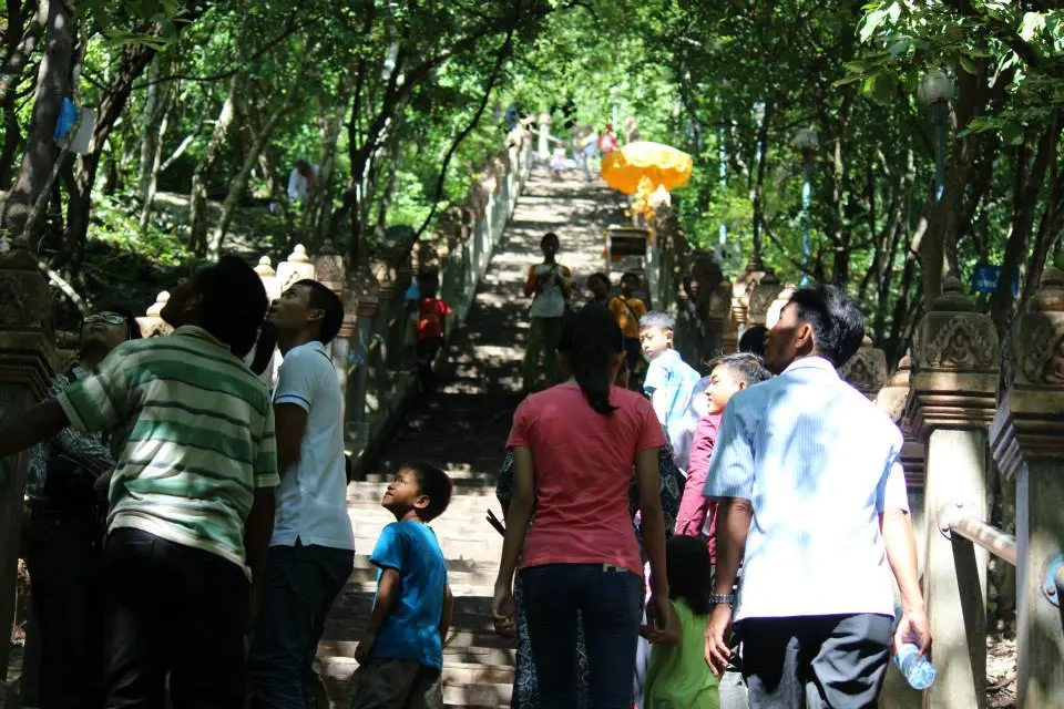 เบื้องหน้าของเรานั้นมีเพื่อนร่วมทางมากมาย แต่ด้านหลังของเรานั้นไม่มีใคร พยายามในการเดินขึ้นแล้วมองรอบด้านถือขึ้นไปเพียงขวดน้ำเพียงพอแล้ว เหลืออีกไม่เยอะประมาณห้าสิบขั้นเรานั้นก็จะถึงแล้ว ด้านบนนั้นถือว่าสูงขนาดมองเห็นเมืองพนมเปญทั้งเมืองได้อย่างสบาย ลมนั้นเย็นมาก เรานั้นออกมาจากพนมเปญไม่ไกล ในเมืองพนมเปญนั้นชื่อพนมแปลว่าภูเขานั้นจริง แต่ว่าในเมืองนั้นไม่มีในส่วนของภูเขาเลยแม้แต่อันเดียวเลย