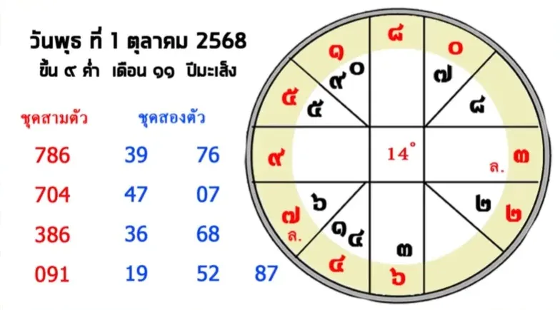 สำหรับหวยงวดที่จะถึงนี้ ก็ออกวันพุธ ที่ 1 ตุลาคม พศ.2568 ซึ่งตรงกับวันขึ้น 9 ค่ำ เดือน 11 ปีมะเส็ง หลังจากการดูการโคจรของดวงดาวต่างๆ แล้ว สามารถที่จะตีเป็นเลขเด็ดได้ดังนี้