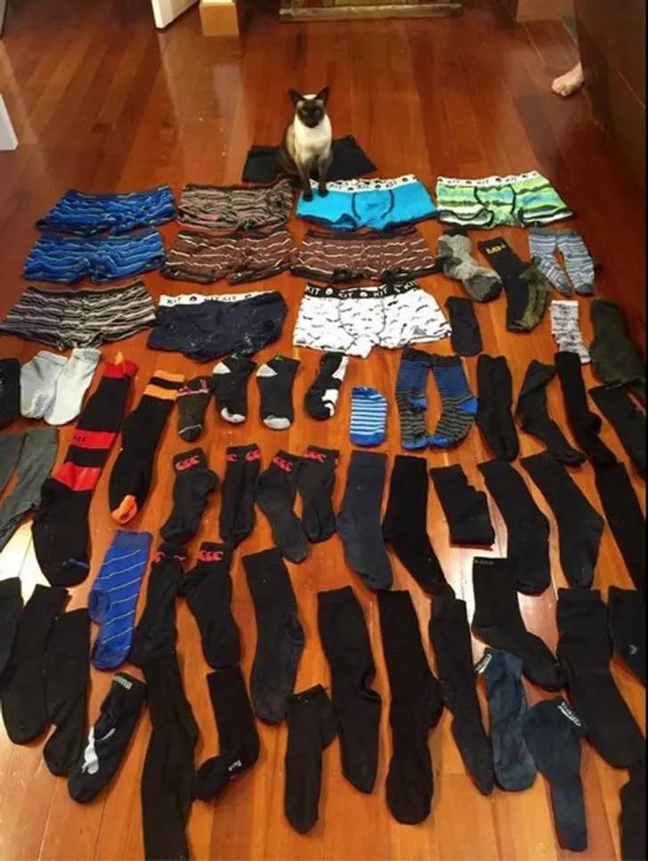 19. วันนี้เราพบว่าแมวของเราขโมยกางเกงชั้นในและถุงเท้าของผู้ชายจากเพื่อนบ้านมาตลอด