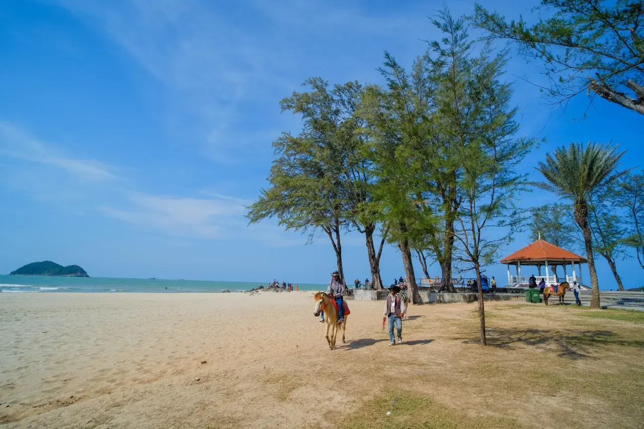 ชายหาดยังทอดยาวเชื่อมต่อไปถึงแหลมสนอ่อนที่อยู่ทางตะวันตก ความยาวของแหลมนี้ทอดตัวไปจนถึงสันเขื่อนกลางทะเล เป็นอีกหนึ่งมุมสงบที่เหมาะสำหรับเดินเล่นหรือปั่นจักรยานชิล ๆ ไปตามแนวชายหาดที่เต็มไปด้วยสายลมและกลิ่นอายของท้องทะเลใต้