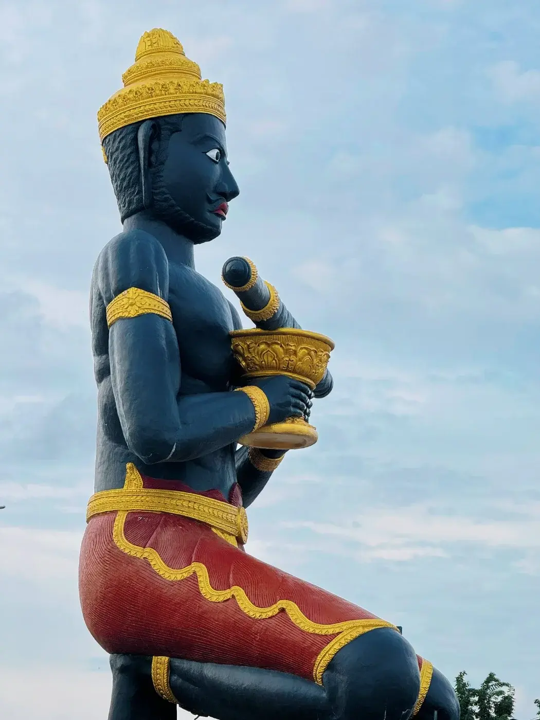 พระตระบอง เราเดินทางมาที่นี่เพื่อที่จะเที่ยวแต่ก่อนที่จะเดินทางต่อนั้นเรานอนที่โรงแรมบริเวณนี้หนึ่งคืน ตอนที่รถนั้นจอดให้เรานั้นลงไปเพื่อสักการะจริงก็น่ากลัวนะ ตัวใหญ่นั่งขวางถนน ครั้งแรกหากว่ามองคือเหมือนยมบาลกางเกงแดงตัวดำปี๋เลย ทำไมว่าดำปี๋คือดำถ่ายเลย ในส่วนของใบหน้าสีหน้า ไม่ยิ้มด้วย เราเองก็ยิ้มใส่นะ แต่ไม่ยิ้มให้เลย