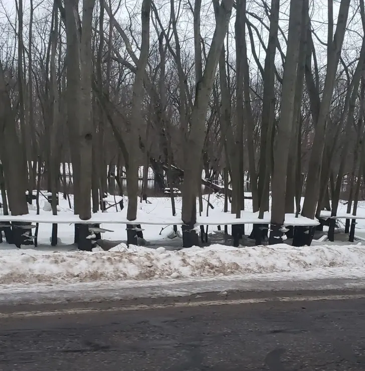15. แม่น้ำใกล้ ๆ ฉันท่วม จากนั้นก็แข็งตัวจากหิมะที่ตกลงมา จากนั้นน้ำก็ลดลง เหลือเพียงชั้นน้ำแข็งลอยติดอยู่บนต้นไม้