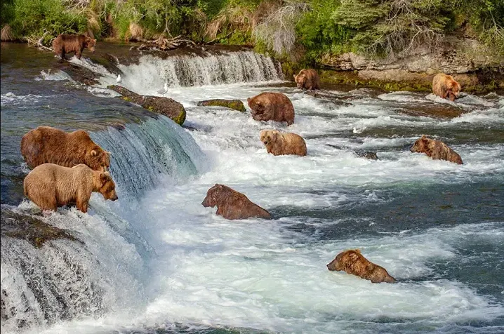 ช่วงประมาณ เดือน กันยายน - ตุลาคม น้ำตกบรุ๊คฟอลส์ จะเต็มไปด้วยนักท่องเที่ยวจำนวนมาก ที่ขึ้นมาชมเจ้าหมีกรีซลี่ที่ออกล่าปลาแซลมอน บริเวณน้ำตก บางครั้งอาจจะเจอพวกมันมากถึง 50 ตัวเลยทีเดียว ในช่วงฤดูอื่น หมีกรีซลี่ จะกินผลไม้จำพวก เบอร์รี่ ลูกโอ๊ค ยอดอ่อนของพืช น้ำผึ้ง แมลง หรือสัตว์ตัวเล็กๆ เป็นอาหาร พวกมันจะรอให้ถึงฤดูแซลมอนวางไข่อีกครั้งหนึ่งจึงจะกลับมาที่นี่!!!