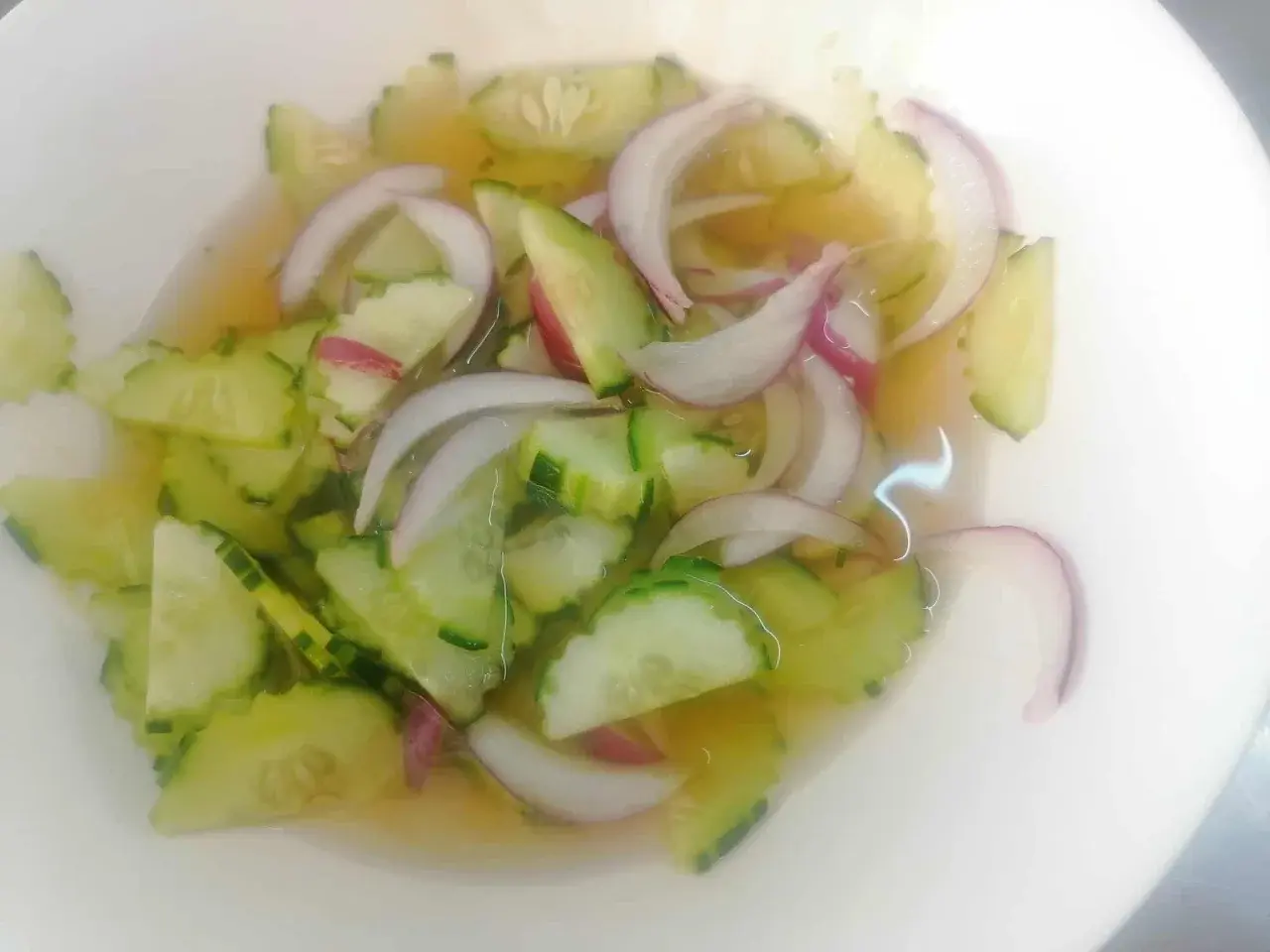 - ซอยแตงกวา หอมแดง ใส่ถ้วย เทน้ำราดที่เสร็จแล้ว ลงในถ้วยได้เลย