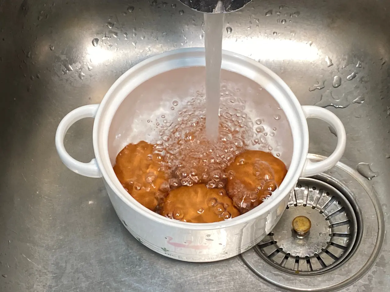 - เปิดน้ำก๊อกเบาๆ 🚰 ปอกเปลือกใต้น้ำไหล **ให้น้ำช่วยแทรกซึมระหว่างเยื่อกับเปลือก** 💦