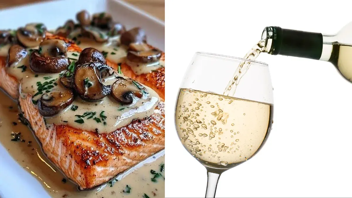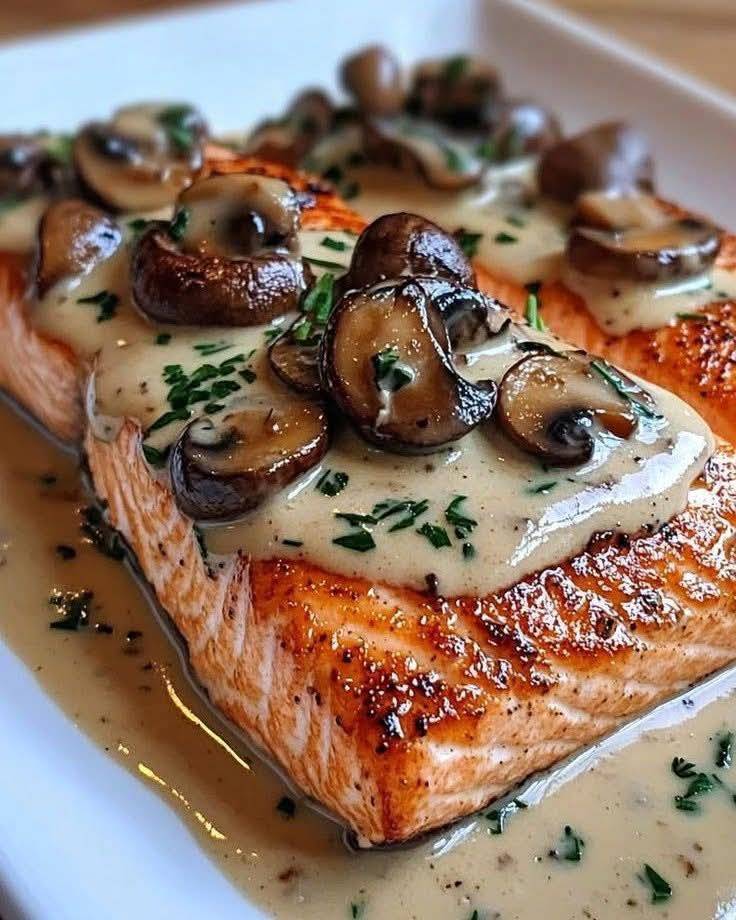วางแซลมอนอบหรือทอดบนจานและราดด้วยซอสครีมมี่เห็ดกระเทียม