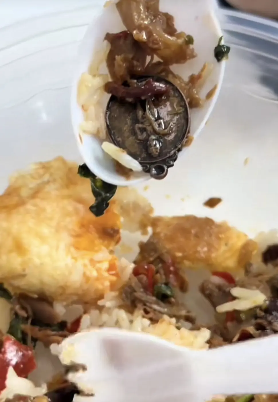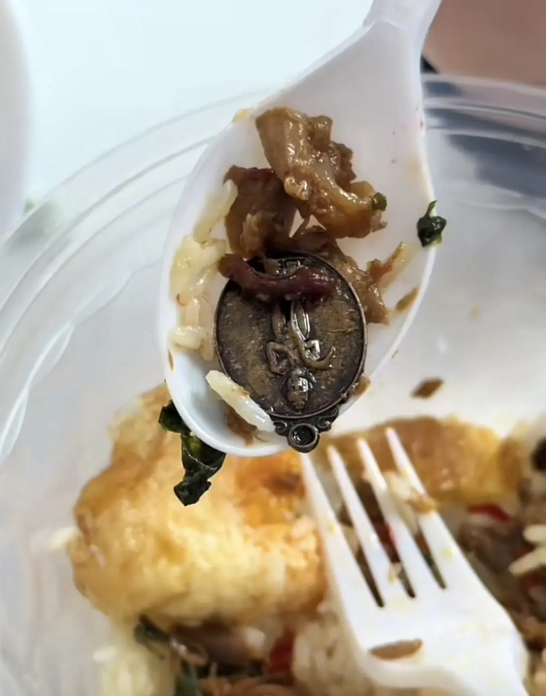เมื่อลูกค้าสั่งผัดกะเพราไข่ดาวราดข้าว เปิดกล่องออกมากินไปสั่งพัก ก็สังเกตเห็นวัตถุแข็งๆ ผสมมากับกะเพรา ลองเขี่ยมาดู คุณพระ!! คุณพระของแท้ พระเครื่องมาได้ไง 😂 แม่ค้าผัดกะเพราท่าไหนถึงลงไปแบบนี้ นี่มันอาหารมงคลชัด ๆ 😂