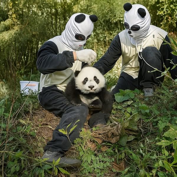 ในภาพที่ถูกแชร์ออกมา สัตวแพทย์สองคนใส่ชุดแพนด้าเต็มตัว นั่งอยู่กลางป่าเขียวชอุ่ม กำลังตรวจสุขภาพให้ลูกแพนด้าตัวน้อย น้องแพนด้านั่งอยู่บนตักของหนึ่งในนั้น แล้วหันหน้ามามองกล้องแบบ “งง ๆ” สีหน้าเหมือนจะพูดว่า “นี่กูดูโง่ขนาดนี้เชี้ยวหรือ?”