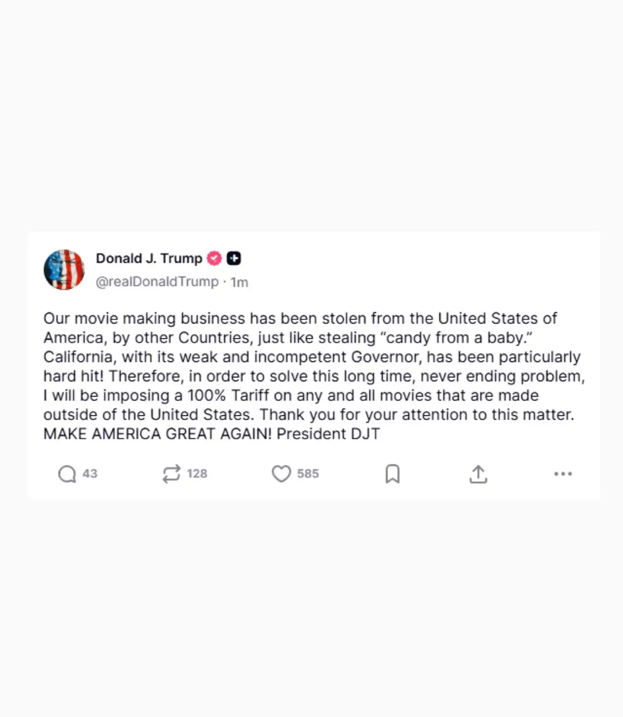 ทรัมป์ให้เหตุผลว่า ธุรกิจหนังของอเมริกาถูก “ขโมย” ไปโดยประเทศอื่น ๆ เปรียบเหมือนการแย่งลูกอมจากเด็กทารกกันเลยทีเดียว