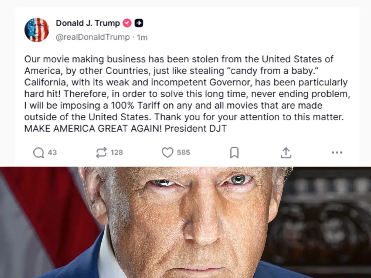 เขาประกาศว่าจะเก็บ ภาษีศุลกากร 100% สำหรับภาพยนตร์ทุกเรื่องที่สร้างขึ้นนอกประเทศสหรัฐอเมริกา