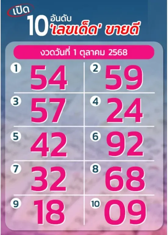 มาแล้ว! เปิด 10 อันดับเลขเด็ดขายดี งวดวันที่ 1 ตุลาคม 68..ส่องเลย พรุ่งนี้รวย!!