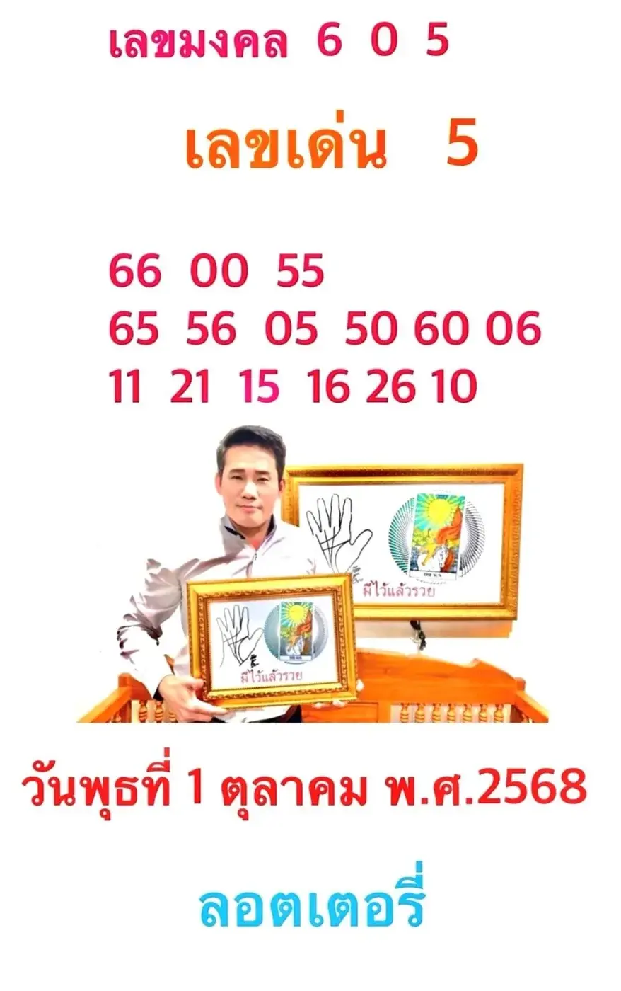 ทั้งนี้ทาง อ.มงคล ก็ได้ทำนายว่า ฤกษ์ดีประจำวันพุธนี้ คือ 10.09 - 16.09 น. สำหรับสีที่เป็นมงคลก็คือ สีเขียว สีขาว สีน้ำเงิน ส่วนเลขไพ่ยิปซีที่จับได้ทั้งหมดก็มี 6 0 5 1 2 ซึ่งเลขมงคลก็มี 6 0 5 โดยมีเลขเด่น คือ เลข 5 และสำหรับเลขท้าย 2 ตัวที่น่าสนใจก็มีเลข 66 00 55 65 56 05 50 60 06 ส่วนเลขแปลงก็มีเลข 11 21 21 15 51 16 61 26 62 10 01