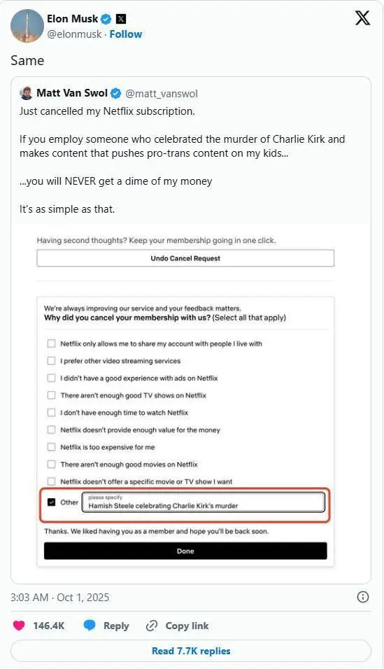 เมื่อแมตต์ แวน สโวล อดีตนักวิทยาศาสตร์นิวเคลียร์จากกระทรวงพลังงาน โพสต์ว่าเพิ่งยกเลิกการสมัคร Netflix มัสก์ก็ตอบกลับมาสั้นๆ ว่า "ฉันก็เหมือนกัน"