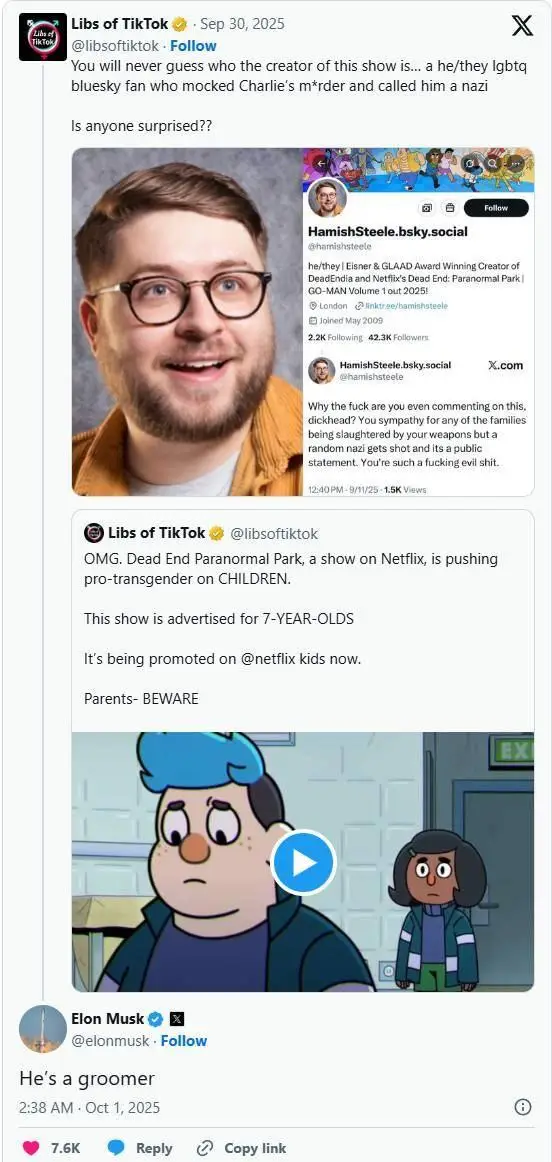 นอกจากนี้ Hamish Steele ผู้กำกับแอนิเมชั่นเรื่อง "Dead End: Paranormal Park" ยังถูกเปิดโปงเมื่อไม่นานนี้ว่าใช้คำหยาบคายสาปแช่งการตายของ Kirk บนโซเชียลมีเดีย โดยเรียกเขาว่า "พวกนาซี"
