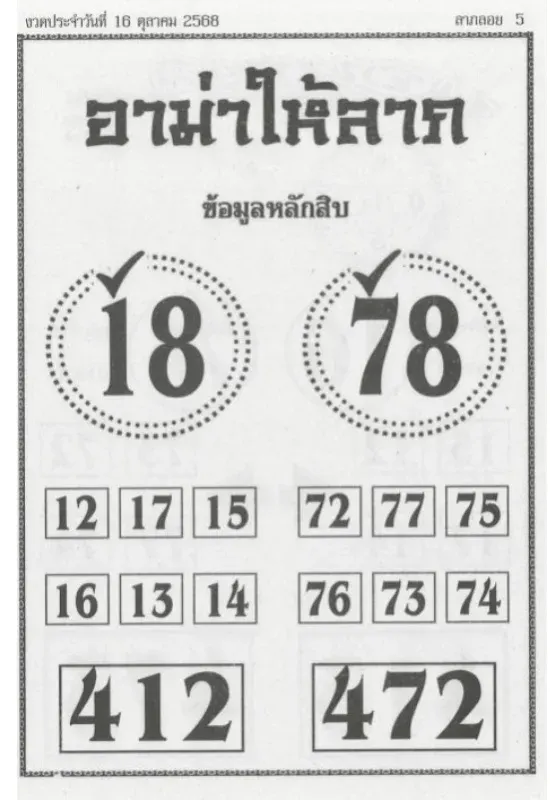 สำหรับในงวดนี้ เลขเด็ด อาม่าให้ลาภ งวดวันที่ 16 ตุลาคม 2568 ซึ่งเป็นโพยหวยสายเลขชุดสุดสวยจากญาติผู้ใหญ่ใจดี ทางทีมงาน...ลอตเตอรีก็ได้ทำการวิเคราะห์แล้วว่า เลขเด่นนั้นน่าจะเป็นเลข 1 - 7 เพราะในใบสลากฯ ก็มีเครื่องหมายติ๊กถูกเอาไว้อย่างชัดเจน ถ้าหากเอฟซีท่านใดรู้สึกถูกชะตา ก็สามารถนำเอาตัวเลขเหล่านี้ไปเป็นลายแทงหวยได้เลยตามใจชอบ สำหรับเลขเด็ดจะมีอะไรกันบ้างนั้น ก็ตามไปส่องกันได้เลย