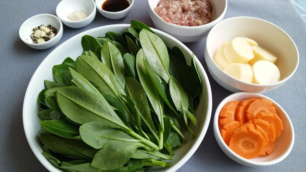 วัตถุดิบและเครื่องปรุงต้มจืด: ใบโสมไทย , เต้าหู้ไข่ , หมูสับปรุงรส, แครอท , กระเทียมบุบ และพริกไทยเม็ดบุบ ซีอิ๊วขาว และ ผงปรุงรส