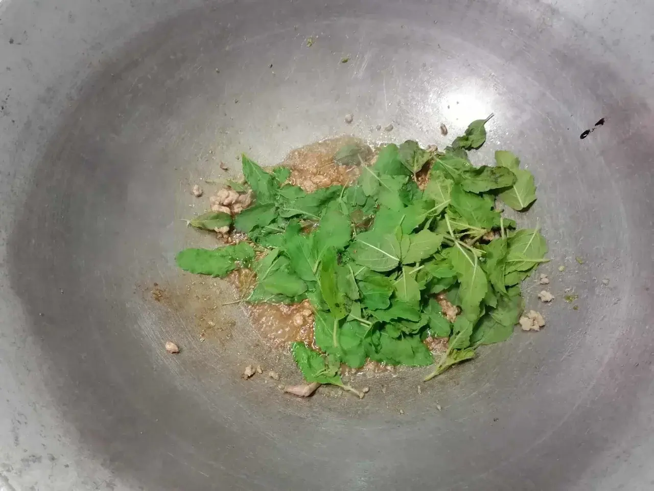 - ใส่ใบกะเพรา ผัดให้เข้ากันอีกครั้งจนแห้งและมีกลิ่นหอม เมื่อใส่ใบกะเพราลงผัด ใบจะยุบตัวลง เป็นอันว่าสุกแล้ว
