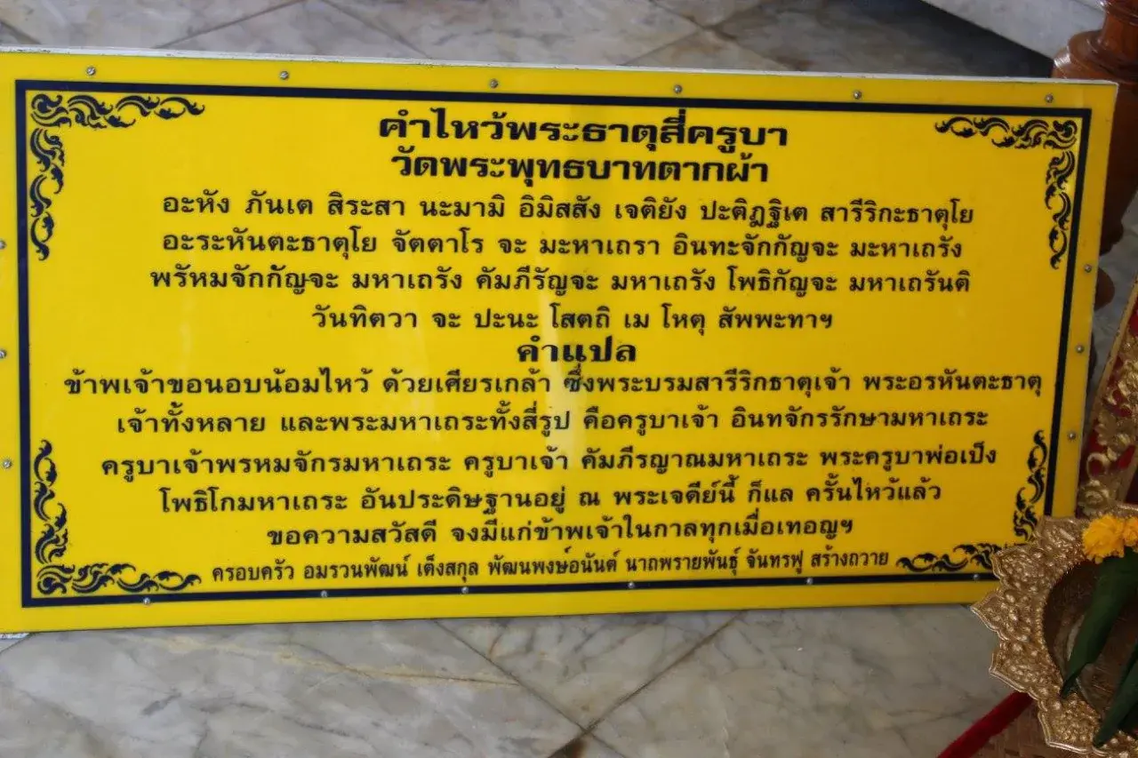 พอเรานั้นเข้ามาด้านในได้มีป้ายในการกราบไหว้ และมีคำไหว้ให้อ่านท่องตาม ซึ่งในป้ายนั้นได้เขียนถึงพระอรหันตะธาตุ เจ้าทั้งหลาย และพระมหาเถระทั้งสี่รูปมารวมกันที่ยี่ และได้นำมาประดิษฐานไว้ที่แห่งนี้ เรียกได้ว่าเรานั้นได้มาที่วัดนี้แห่งเดียวสามารถที่จะได้ไหว้มากกว่าสี่พระมหาเถระเลย