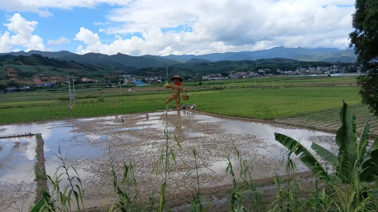 เจ้าหุ่นฟางตัวใหญ่ยักษ์ยืนหรรษาถือตะกร้าครัน มากมายกว่านั้นคือวิวด้านหลังนั้นแสนงดงาม